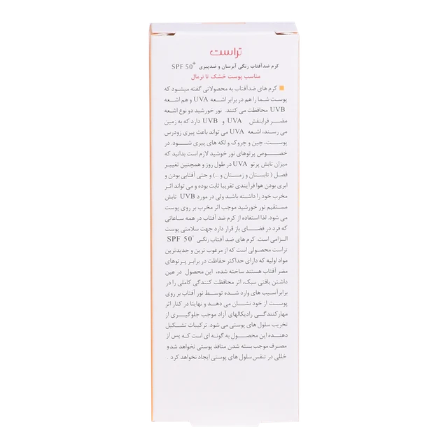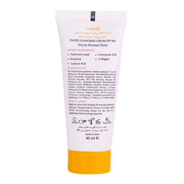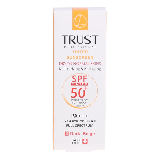 کرم‌های ضدآفتاب رنگی تراست با SPF50+ از مرغوب‌ترین و جدیدترین مواد اولیه موثره دارای حداکثر حفاظت دربرابر پرتوهای مضر خورشید ساخته شده‌اند؛ این کرم با وجود بهره‌مندی از بافتی سبک، دربرابر آسیب‌های وارده توسط نور خورشید به خوبی از پوست محافظت و با مهار رادیکال‌های آزاد از تخریب سلول‌های پوستی جلوگیری می‌کند. همچنین با مصرف این محصول، بدون بسته شدن منافذ پوستی و ایجاد خلل در تنفس سلول‌های پوستی، پوست‌تان آبرسانی می‌شود.