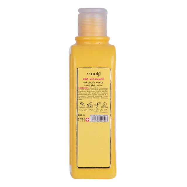 روش مصرف:پوست بدن را به مقدار کافی از شامپو بدن عسل و Q10 تراست آغشته کرده و پس از ۲ تا ۳ دقیقه آبکشی نمایید.