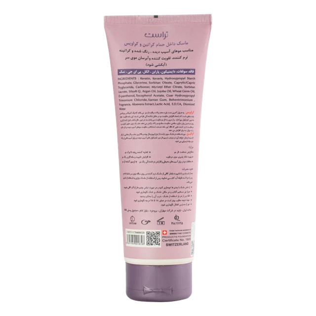 نحوه مصرف: پس از شستشوی کامل مو با شامپو، ماسک موی آبکشی کراتین تراست را روی ساقه موی سرتان بمالید و پس از 2 الی 3 دقیقه، آنها را آبکشی کنید.