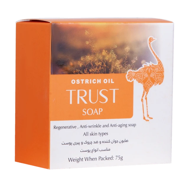 صابون شترمرغ تراست برای اولین بار با بهره گیری از فاز سبک روغن شترمرغ بصورت کاملا خالص (خلوص ۹۸ درصدی) در کنار یک کمپلکس ویتامین در کنار روغن کالاندولا و روغن جوجوبا همراه با کره گیاهی (شی باتر) سبب حفاظت از پوست در برابر شرایط سخت محیطی میگردد. صابون عصاره شترمرغ غنی از امگا۳ و امگا۶ بوده که در کنار روغن جوجوبا با توانایی نفوذ به لایههای زیرین پوست علاوه بر بازسازی و بهبود عملکرد پوست، موجب آبرسانی طولانیمدت پوست میگردد.