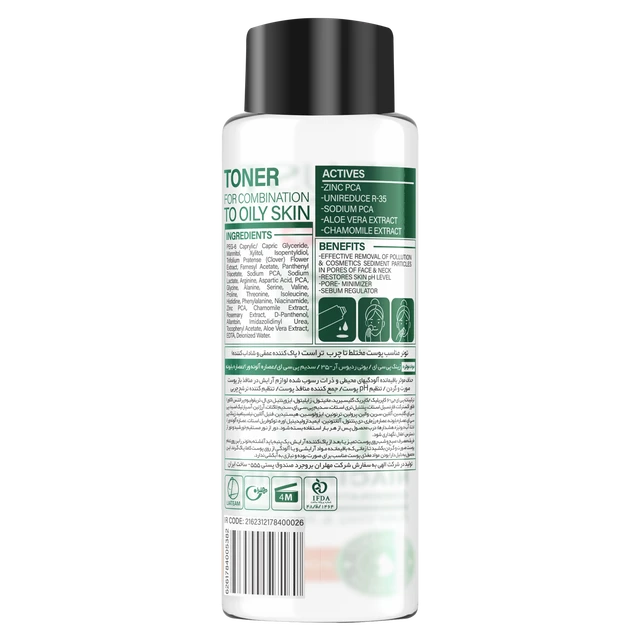 تونر مناسب پوست چرب تا مختلط ، با داشتن زینک پی سی ای و یونی ردیوس آر-۳۵ در ساختار خود، از ایجاد جوش و آکنه جلوگیری کرده و تولید سبوم در پوست را کنترل میکند. سدیم پی سی ای در این محصول، پوست را آبرسانی کرده و به جذب آب در لایههای سطحی پوست کمک میکند. تونر پوست چرب تا مختلط به علت وجود عصاره آلوئهورا، از التهابات پوست جلوگیری کرده و چربی پوست را کنترل میکند. علاوه بر این، وجود عصاره بابونه در تونر پوست چرب تا مختلط باعث ایجاد خواص آنتیاکسیدانی شده و از پوست در برابر آسیب رادیکالهای آزاد مراقبت میکند.