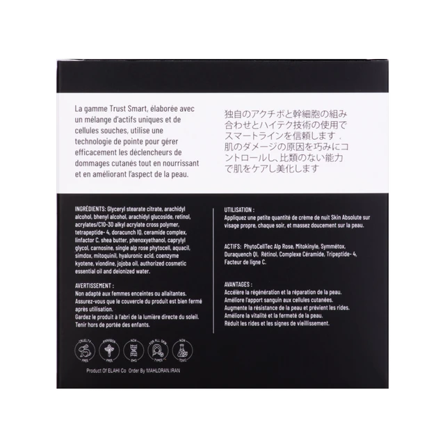 هشدار: استفاده از کرم شب تراست اسمارت برای زنان باردار و مادران شیرده توصیه نمی شود. درب محصول پس از هر بار استفاده بسته گردد.